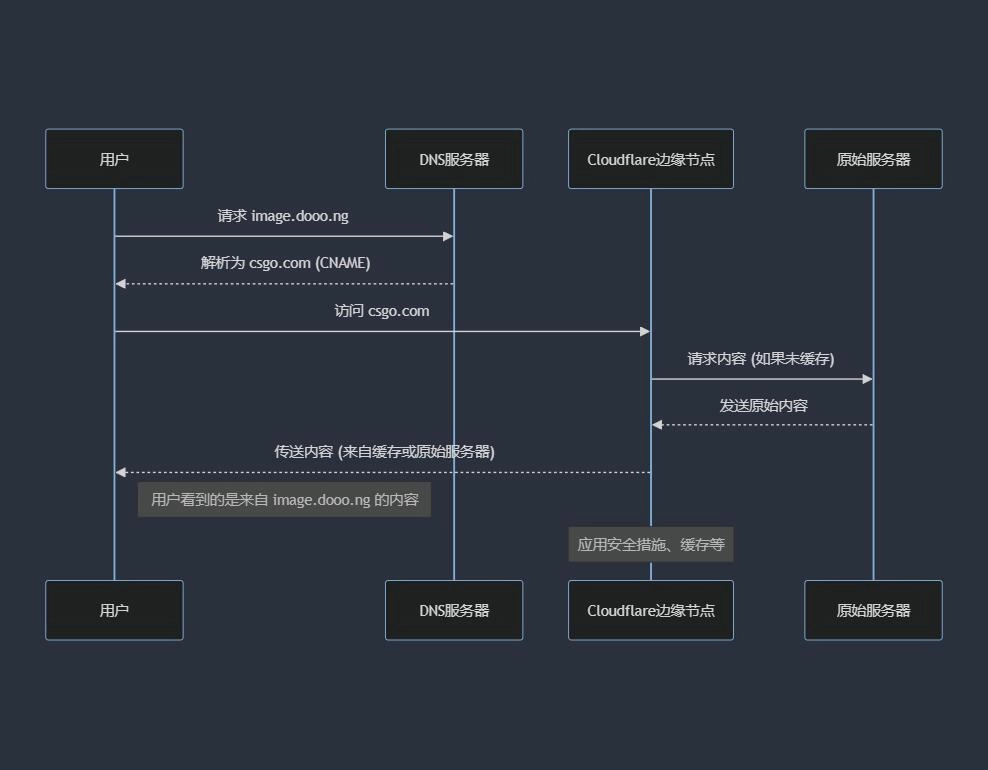 image.dooo.ng实际上是在访问Cloudflare的节点。 - 然后,根据需要,Cloudflare会从原始的回源服务器获取内容。