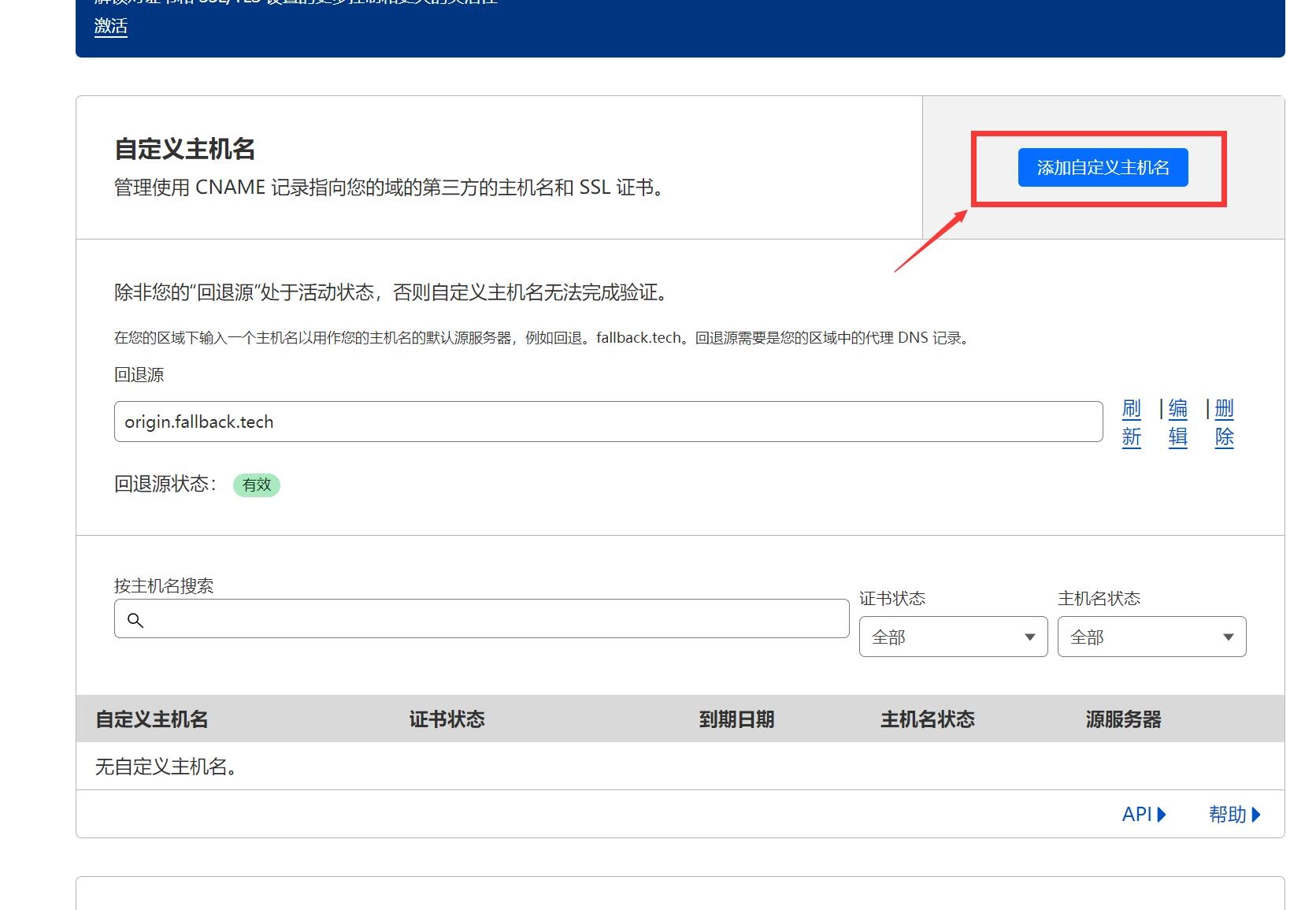 - 这是因为虽然设置了回退源,但是我们并没有设置自定义主机名,也就是回退源并不知道要将哪个主机名回源到我们的服务器IP
